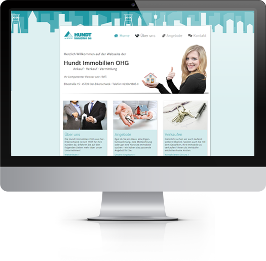 Die Hundt Immobilien OHG ist bereits seit vielen Jahren in der Immobilien-Branche tätig. Um das Unternehmen auch angemessen im Internet zu repräsentieren, sollte daher eine modern aussehende, mit Bildern untermalte und einfach erweiterbare Webseite erstellt werden. Zudem sollte die Immobilienscout24.de Seite des Kunden direkt in die Webseite integriert werden, um die Benutzerfreundlichkeit zu erhöhen und doppelte Arbeit zu vermeiden.