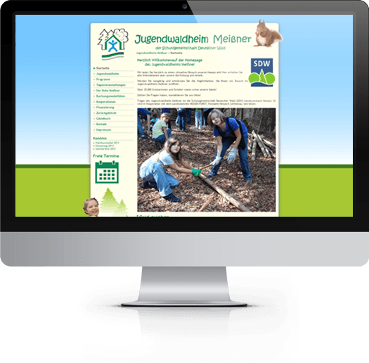 Das Jugendwaldheim-Meißner - meine ehemalige Zivildienststelle - bietet Schulklassen ein waldpädagogisches Wochenprogramm für Klassenfahrten an. Das Angebot sollte auf der Webseite umfangreich und ansprechend dargestellt werden. Das Design wurde als Bilddatei vom Jugendwaldheim zur Verfügung gestellt und von mir in Contao umgesetzt.