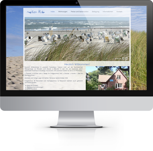 Die Maison Kribi ist ein Ferienhaus auf der Insel Wangerooge, das aus 2 Wohnungen besteht und Platz für bis zu 10 Personen bietet. Um das Haus bzw. die beiden Wohnungen potentiellen Gästen präsentieren zu können, sollte die bestehende Webseite grundlegend überarbeitet werden. Neben der Einbindung einer größeren Auswahl von Bildern wurde außerdem eine Buchungsübersicht in die Webseite integriert, in der die Verfügbarkeit der jeweiligen Wohnungen eingetragen werden können.