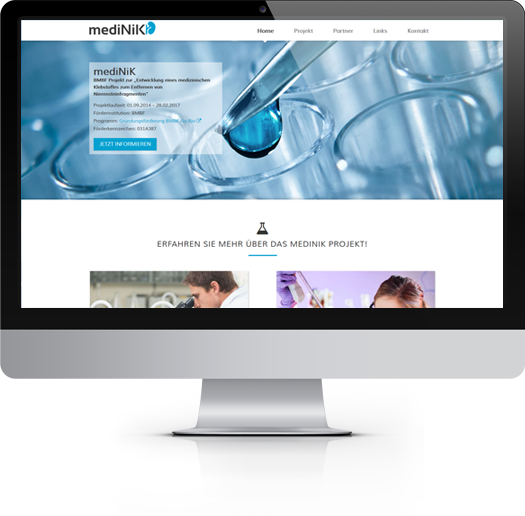 Das mediNiK Projekt wird vom Bundesministerium für Bildung und Forschung gefördert und verfolgt die Entwicklung eines medizinischen Klebstoffes zum Entfernen von Nierensteinfragmenten. Ziel ist es, das neue Produkt in der Projektlaufzeit zur Marktreife zu führen. Insofern stand eine professionelle Präsentation des Projektes im Mittelpunkt meiner Leistungen. Neben dem Webdesign wurde außerdem ein Logo und damit verbunden ein Farbschema für die zukünftige Öffentlichkeitsarbeit des Projektes entworfen.