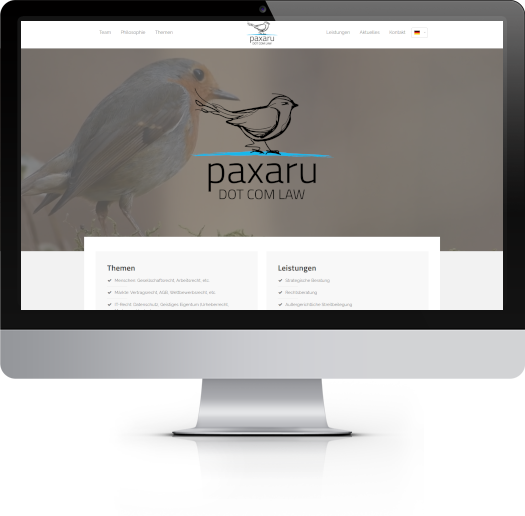 Paxaru ist eine Rechtanwaltskanzlei, die Leistungen im Bereich IT-Recht bietet. Ein besonderer Schwerpunkt liegt dabei auf der Beratung zum Thema Datenschutz, Internationalisierung und die Etablierung neuer Geschäftsmodelle (Start-Ups). Die Webseite soll die angebotenen Leistungen bewerben und außerdem die Möglichkeit bieten, über aktuelle Entwicklungen zu informieren.